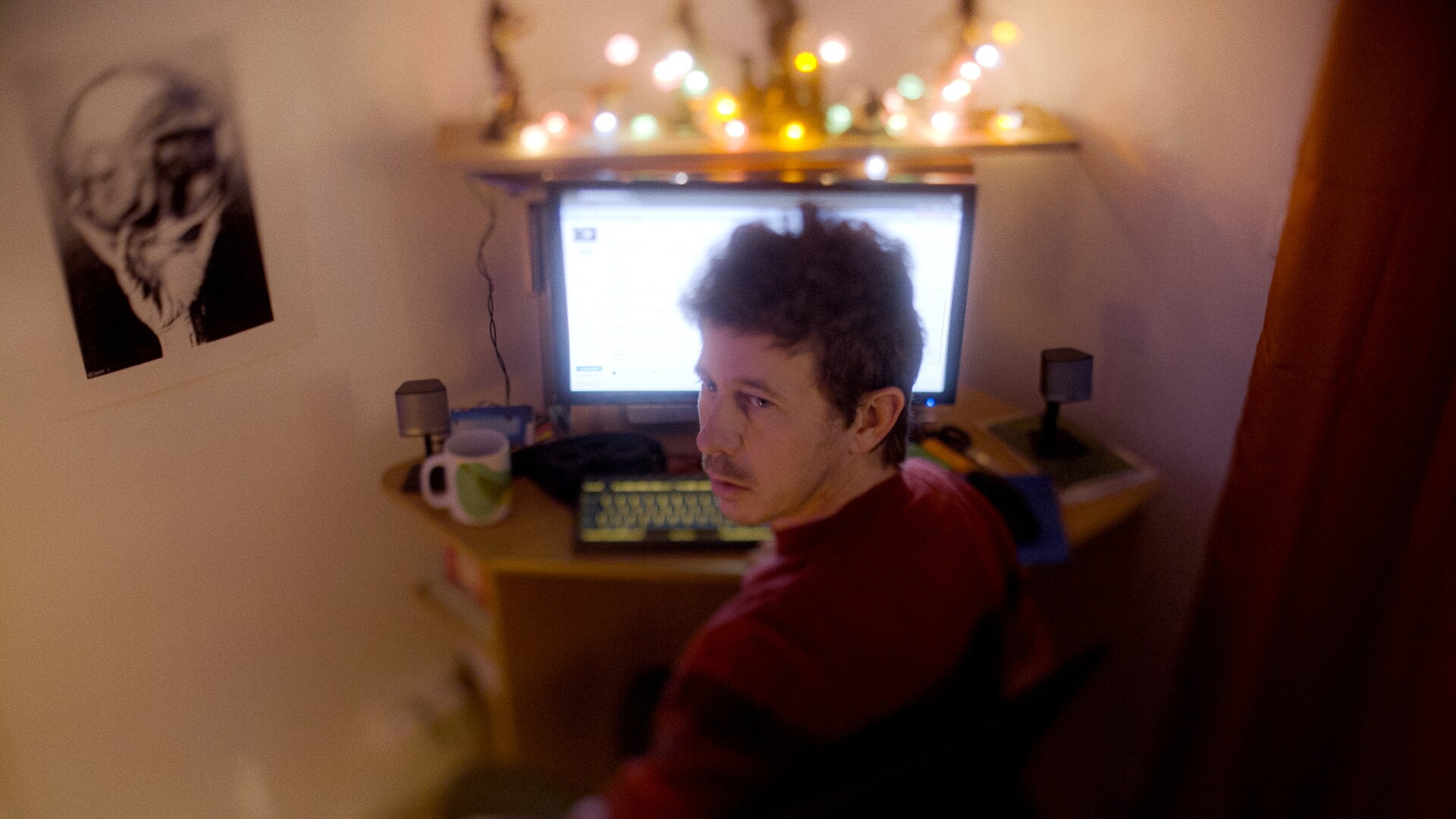 Während er nach einem Einbruch gerade zwei Mitarbeiter eines Schlüsseldienstes bei sich empfängt, ist Frédéric gleichzeitig in einen Online-Chat vertieft.